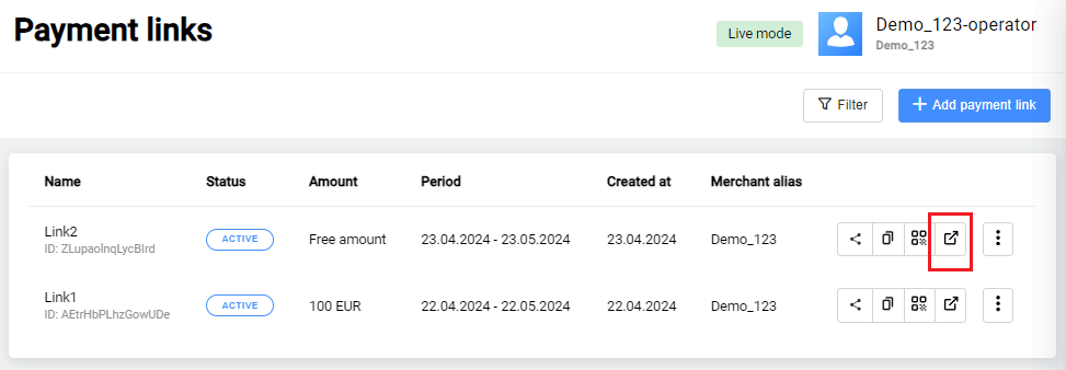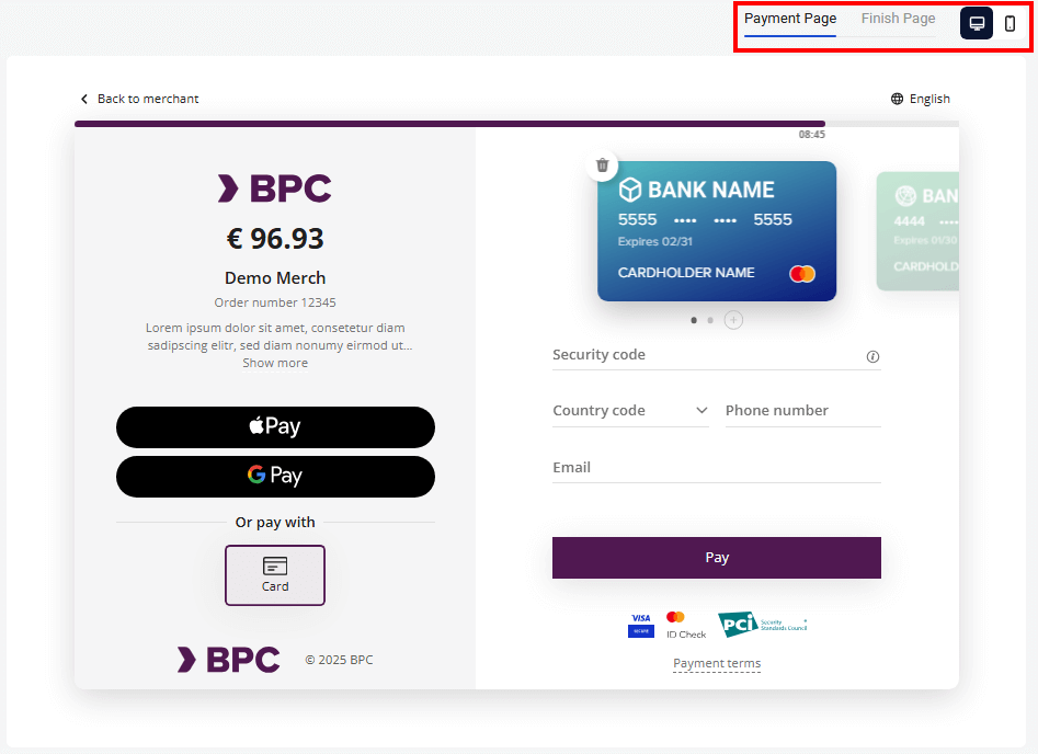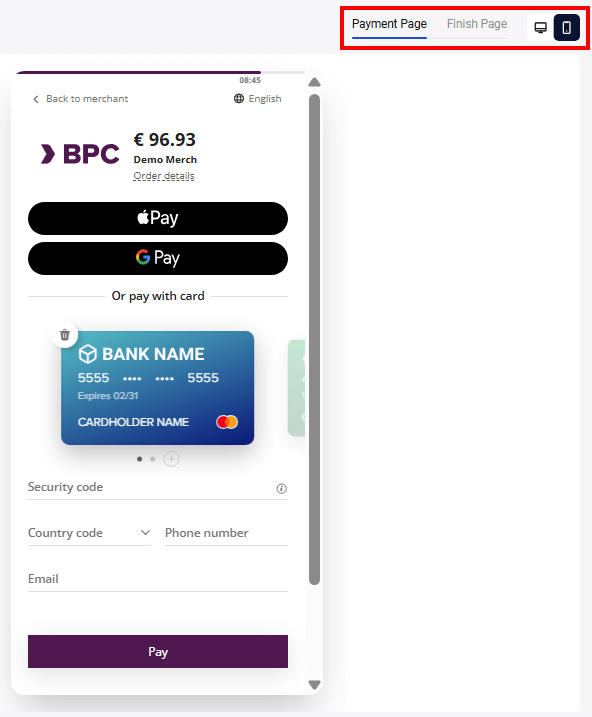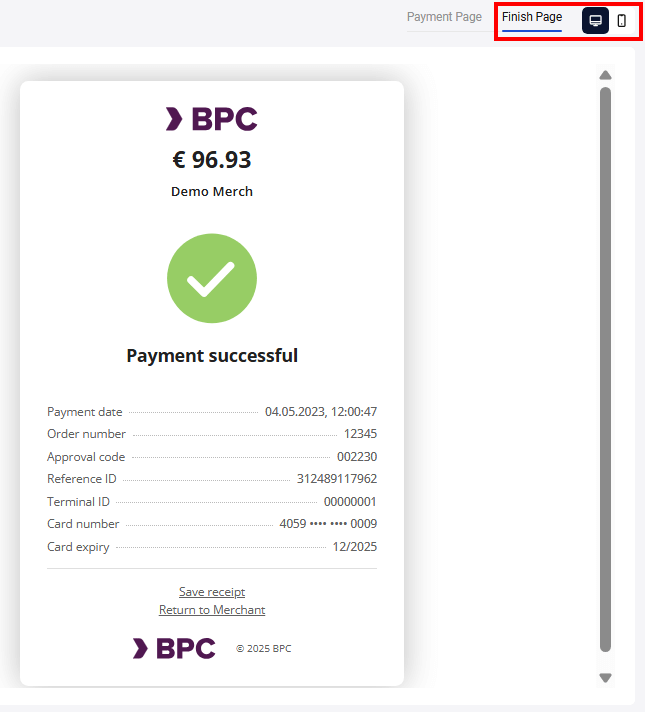 At the top of the page you can choose the format of the payment page display: desktop or mobile: