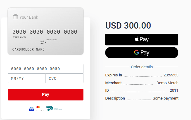 Merchants can create a payment flow as needed. For example, design own fully customized payment page. See more information about API in the API Reference. We authenticate your API requests using the API key - a unique combination of symbols associated with your account. Read about using API key in requests here.