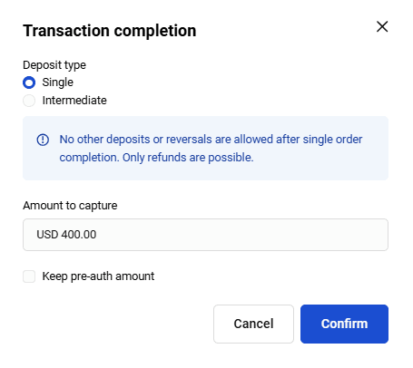 In case of a two-step payment, the funds are first reserved on the client's account (payment status is Uncaptured) and only then are credited to the merchant's account (payment status is Succeeded). It is possible to configure that the final transfer takes place automatically after a certain time set in the system, e.g. after 24 hours. But this operation can be performed manually from the merchant's Personal Area.