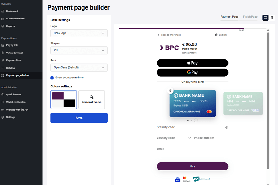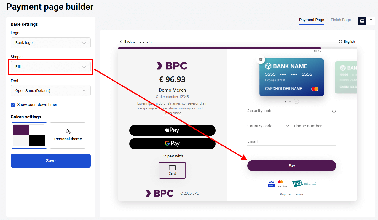 - The right part displays the customizable payment page, which you can modify by adjusting the settings in the left part of the page.