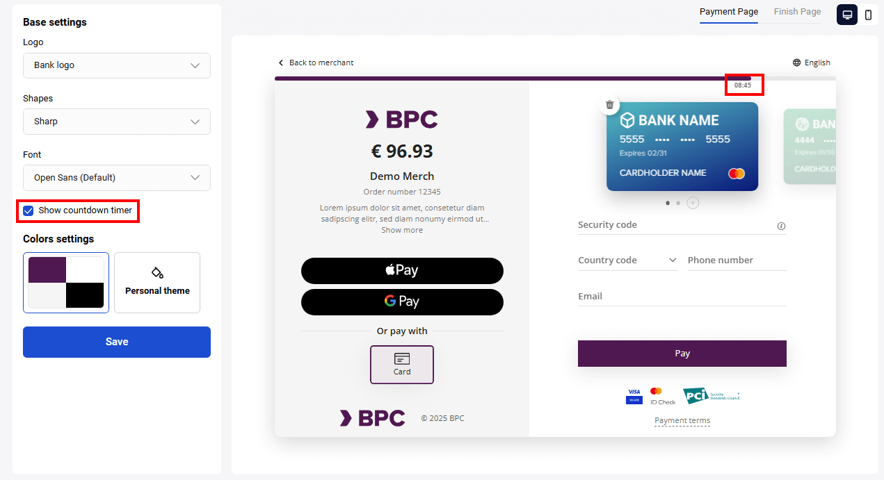 Set whether the countdown timer for making the payment will be shown on the payment page or not: