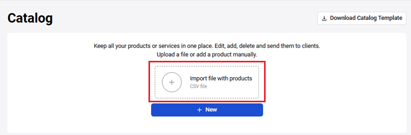 Then upload the completed catalog in .CSV format by clicking Import file with products: