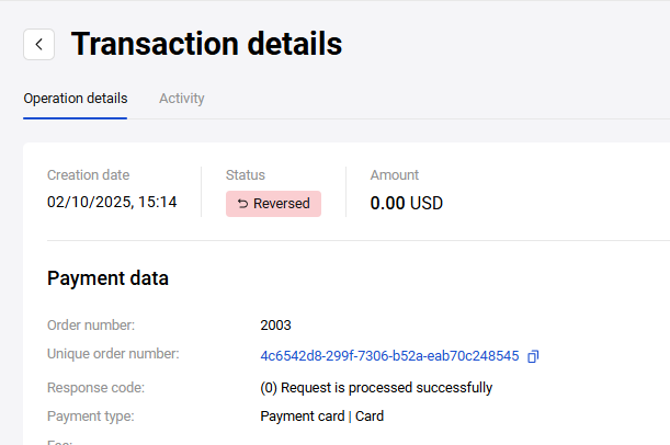 From your Personal Area, you can reverse payments for two-stage transactions in Approved status (when the funds are reserved on the client's account but not deposited yet). Reversal means that the transaction is canceled and all the reserved funds are released.