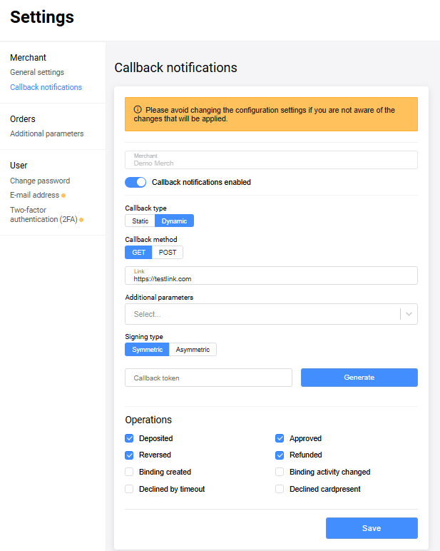 The Merchant Portal allows you to configure callback notifications. This section may be hidden for some Merchants. So if you don't see it or are not sure how to approach this, please contact the Support Service and we will be glad to help.