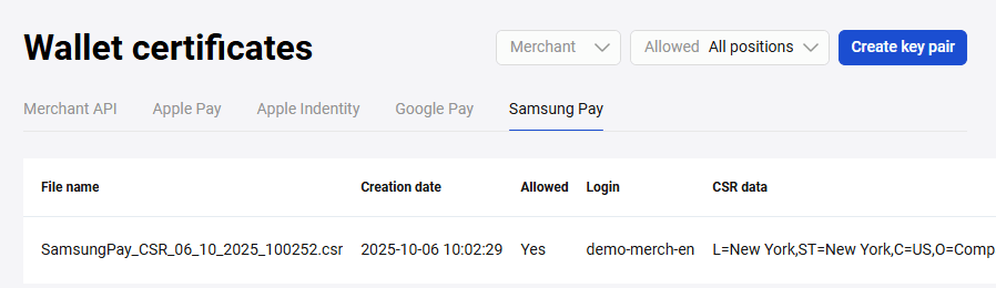 The created key pair will be displayed in the Apple Pay tab (see the figure below).