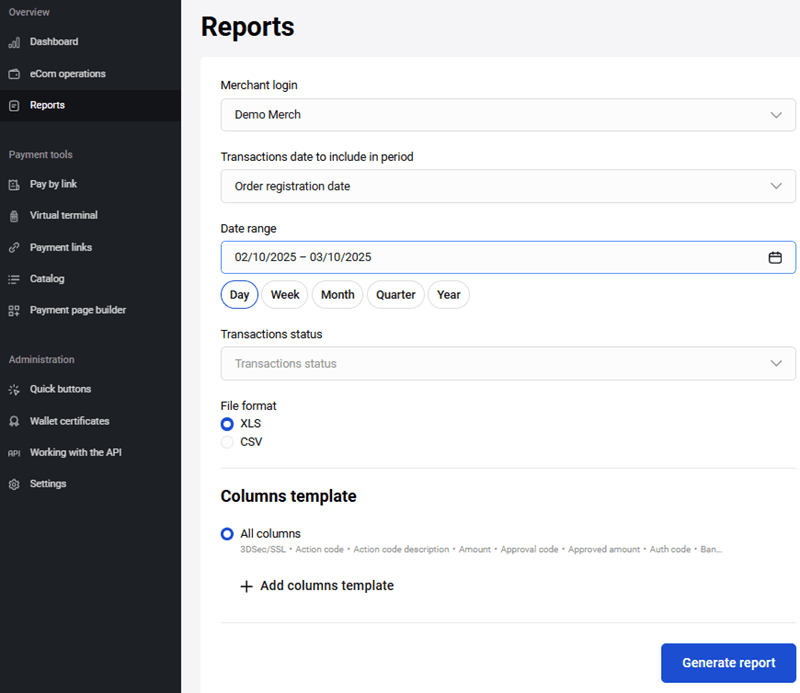 Paramètres généraux - indiquez les informations générales pour l'enregistrement de la commande dans la Passerelle de paiement :