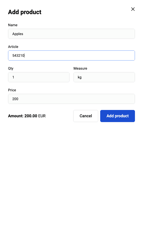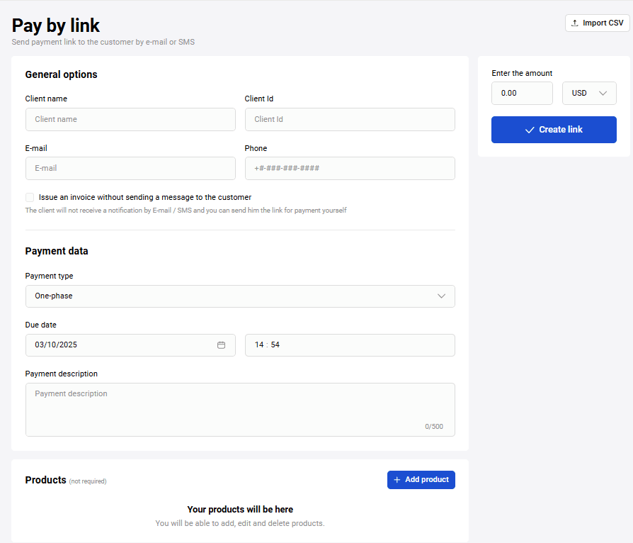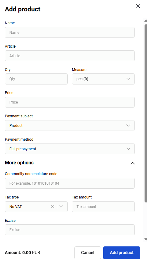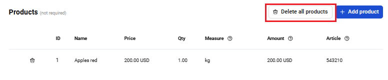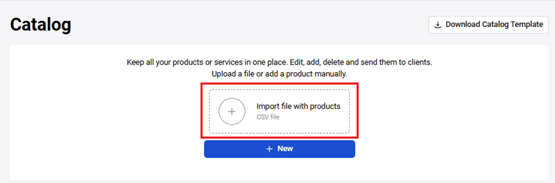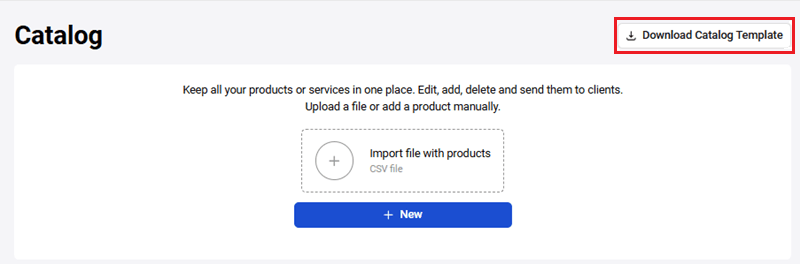 Après le chargement du catalogue de produits ou du/des produit(s) séparément, vous pourrez ajouter des produits du catalogue lors de l'établissement de la facture de paiement. Pour plus de détails sur comment ajouter des produits du catalogue, consultez la section Facture de paiement.