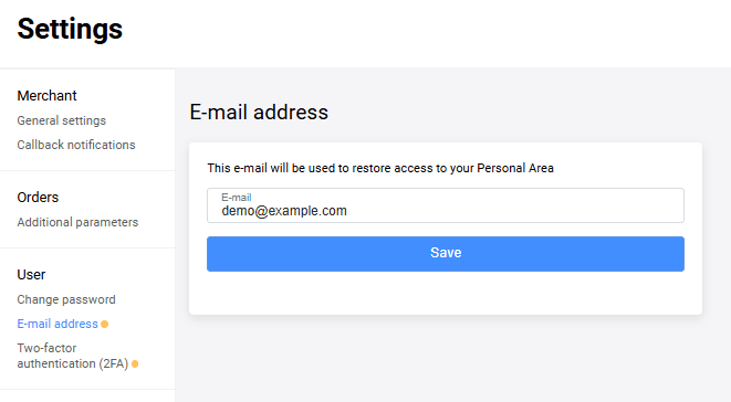| Adresse de courrier électronique du vendeur, à laquelle les notifications seront envoyées. Dans ce champ, vous pouvez saisir plusieurs adresses de courrier électronique (séparées par des virgules). Les déclencheurs pour l'envoi de notifications sont configurables. Ils peuvent être configurés pour des événements tels que le changement de statut de transaction, la création de liaison, etc. | |
