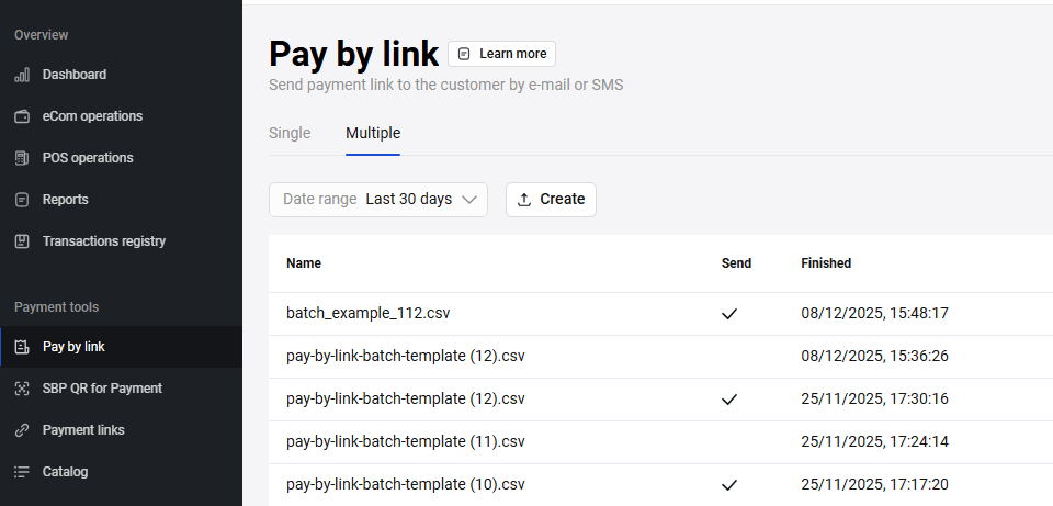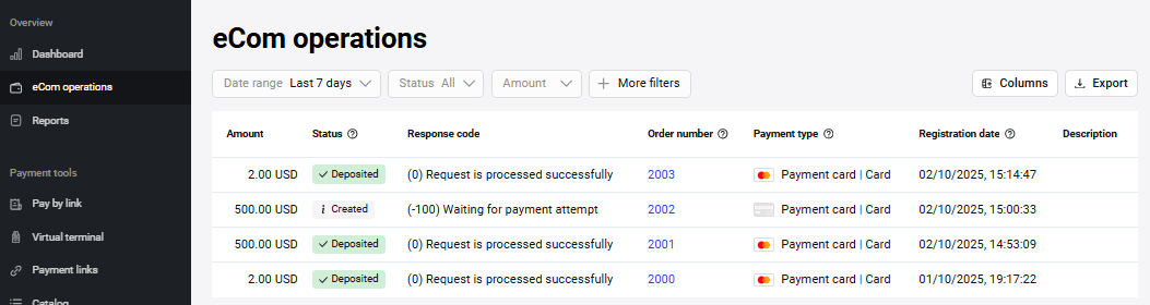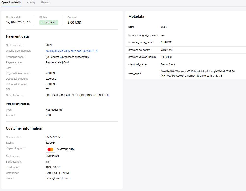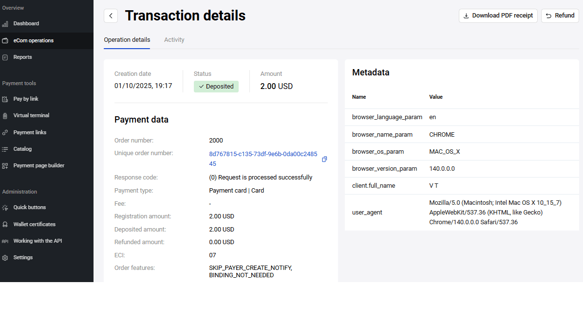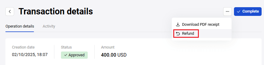 Depuis l'espace personnel, vous pouvez effectuer un remboursement pour les transactions effectuées (commandes payées par les clients qui se trouvent dans le statut Terminée). Pour les paiements en deux étapes, le statut Terminée signifie que les fonds, se trouvant sur la carte du payeur, ont déjà été débités.