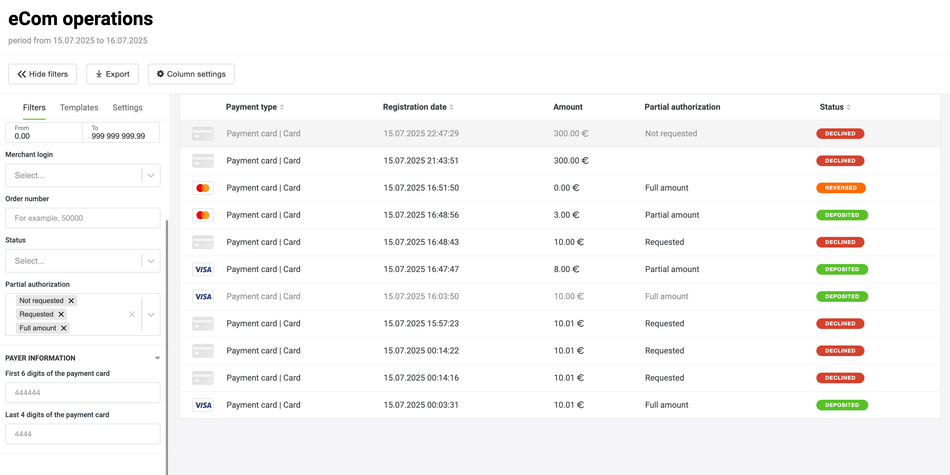 Dans l'espace personnel, vous pouvez annuler les paiements pour les transactions en deux étapes avec le statut Confirmée (quand les fonds sont réservés sur le compte du client, mais pas encore crédités). L'annulation signifie que la transaction est annulée, et tous les fonds réservés sur le compte du client sont débloqués.