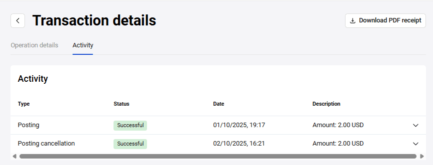 Dans l'espace personnel, vous pouvez annuler les paiements des transactions en deux étapes au statut Confirmée (quand les fonds sont réservés sur le compte du client, mais pas encore crédités). L'annulation signifie que la transaction est annulée, et tous les fonds réservés sur le compte du client sont débloqués.