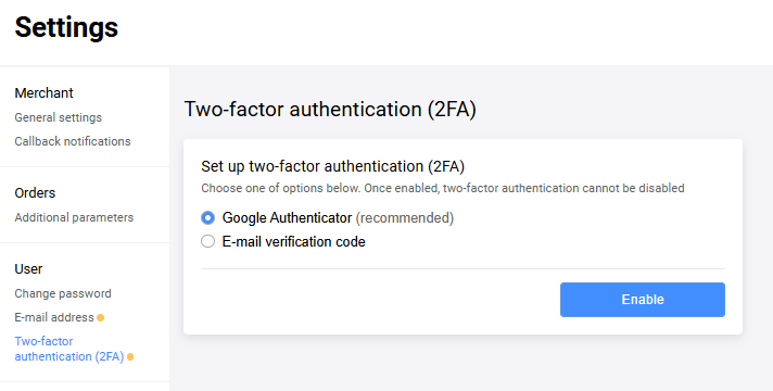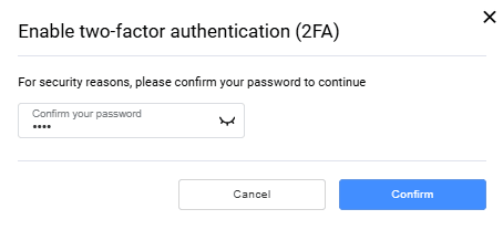 Vous pouvez configurer l'authentification à deux facteurs pour assurer un niveau de sécurité supplémentaire, garantissant que vous seul pouvez avoir accès à votre Espace personnel. Dans ce cas, lors de la connexion à l'Espace personnel, il est nécessaire de saisir non seulement l'identifiant et le mot de passe, mais aussi le code d'authentification généré par l'application Google Authenticator, ou envoyé sur votre adresse e-mail (selon la méthode d'authentification activée).