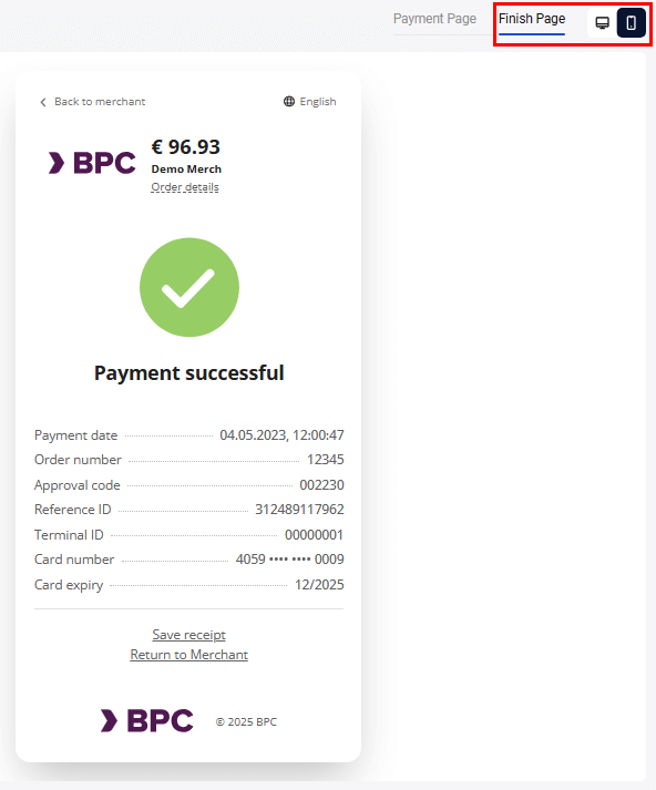At the top of the page you can choose the format of the payment page display: desktop or mobile: