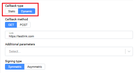 Choisissez l'un des types de signature : Symétrique ou Asymétrique. Si le type de signature symétrique est sélectionné, il est possible de générer un token de callback. De plus, si le type de signature Symétrique est sélectionné, il est possible de saisir le token manuellement.