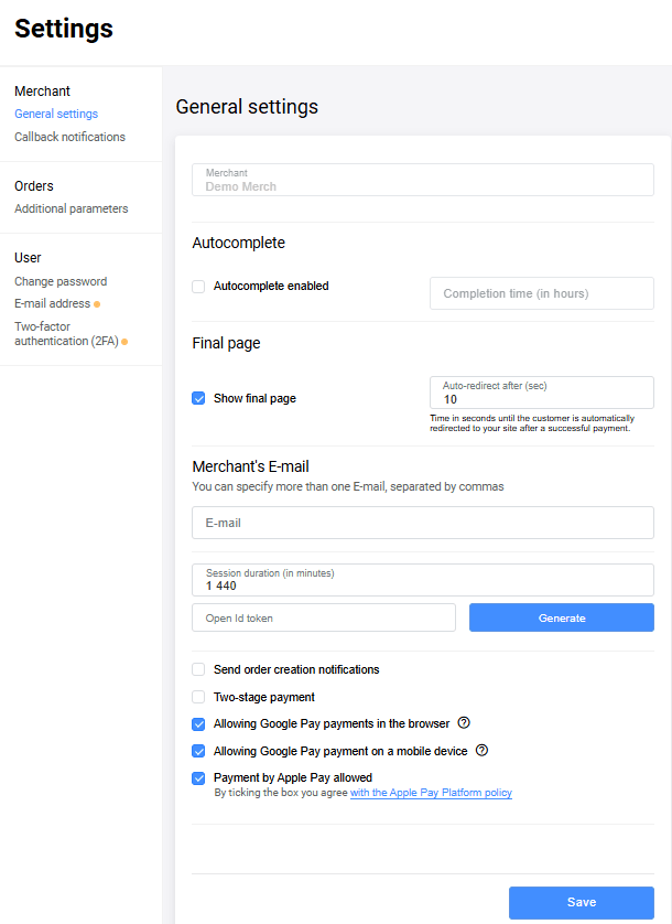 - Demande de données utilisateur - indiquez les données qui seront obligatoires pendant le paiement via PaymentRequest API pour Google Pay. Cochez les cases correspondantes : Nom, E-mail, Numéro de téléphone, Adresse postale.