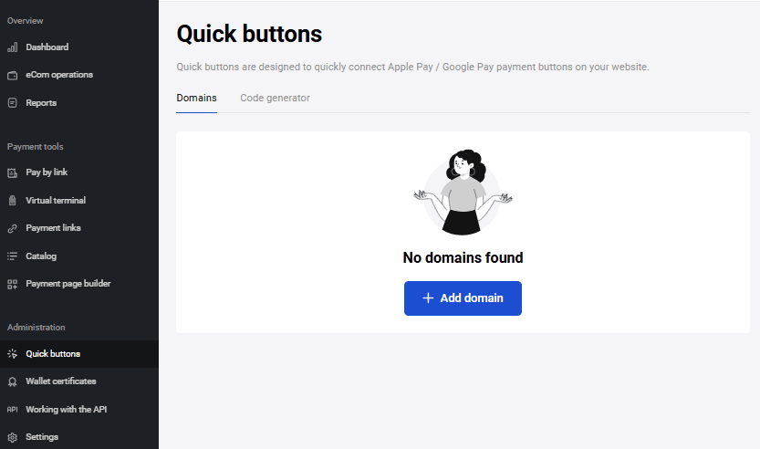La section Boutons rapides permet de connecter rapidement des boutons pour le paiement par Apple Pay / Google Pay sur votre site. Pour ouvrir la section Boutons rapides, cliquez sur