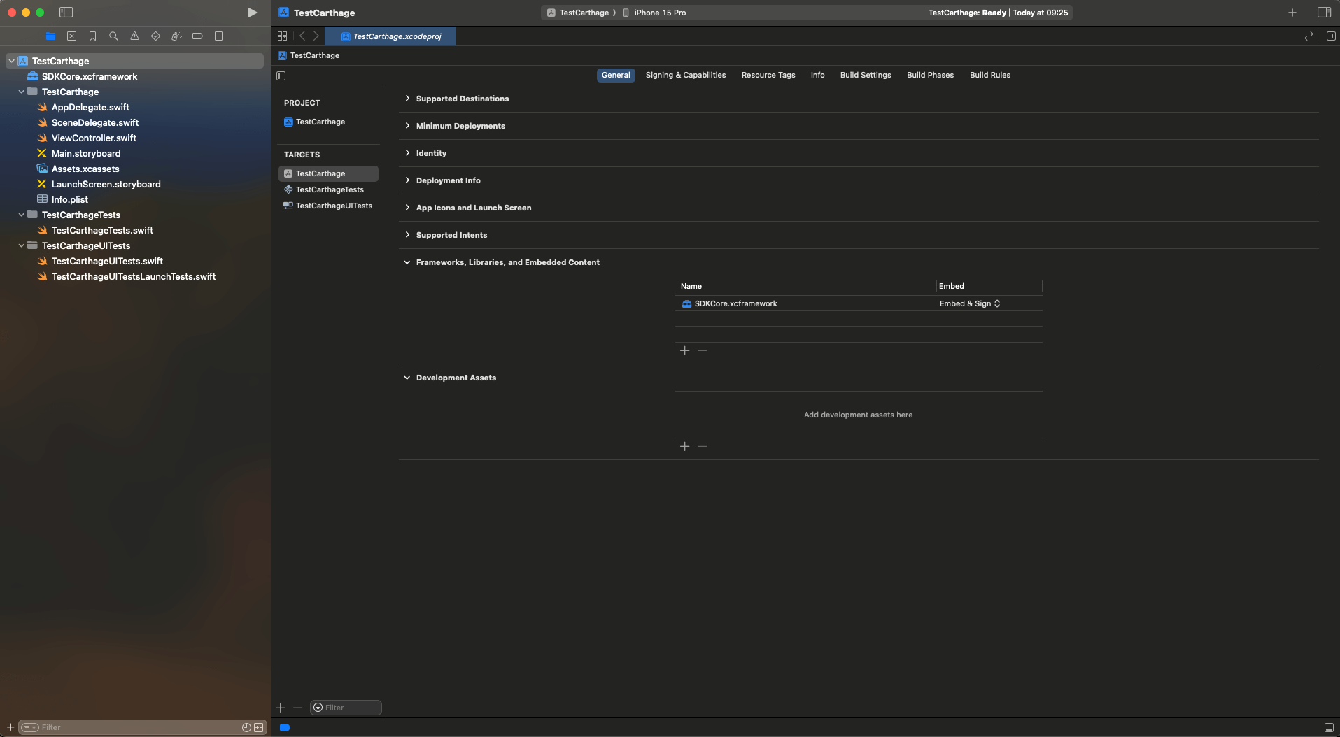 SDKCore.xcframeworken la columna Embed esté seleccionado Embed & Sign.-
